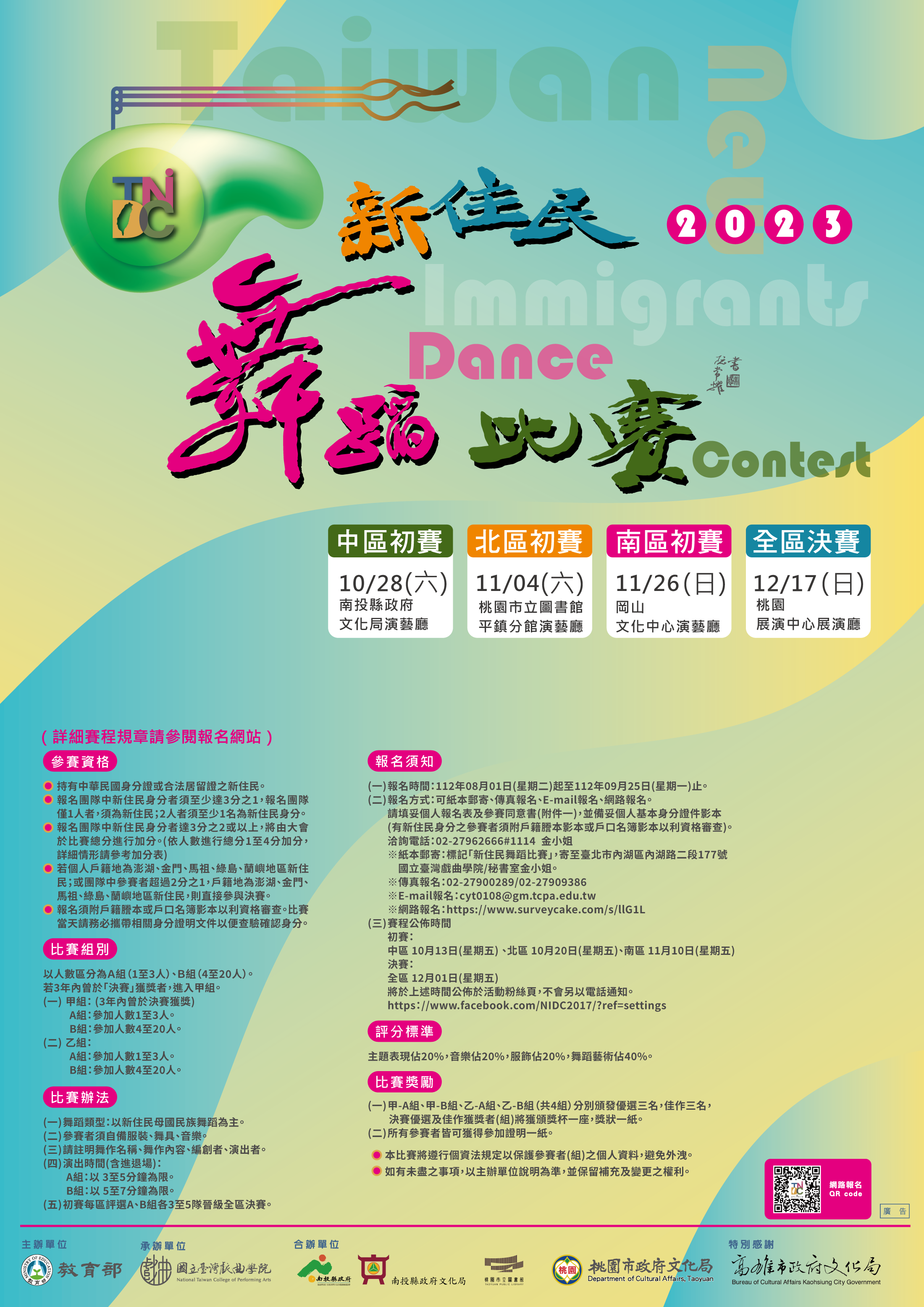 三、參賽資格:持有中華民國身分證或合法居留證之新住民。報名團隊中新住民身分者須至少達3分之1,報名團隊僅2人者須至少1名為新住民身分。
