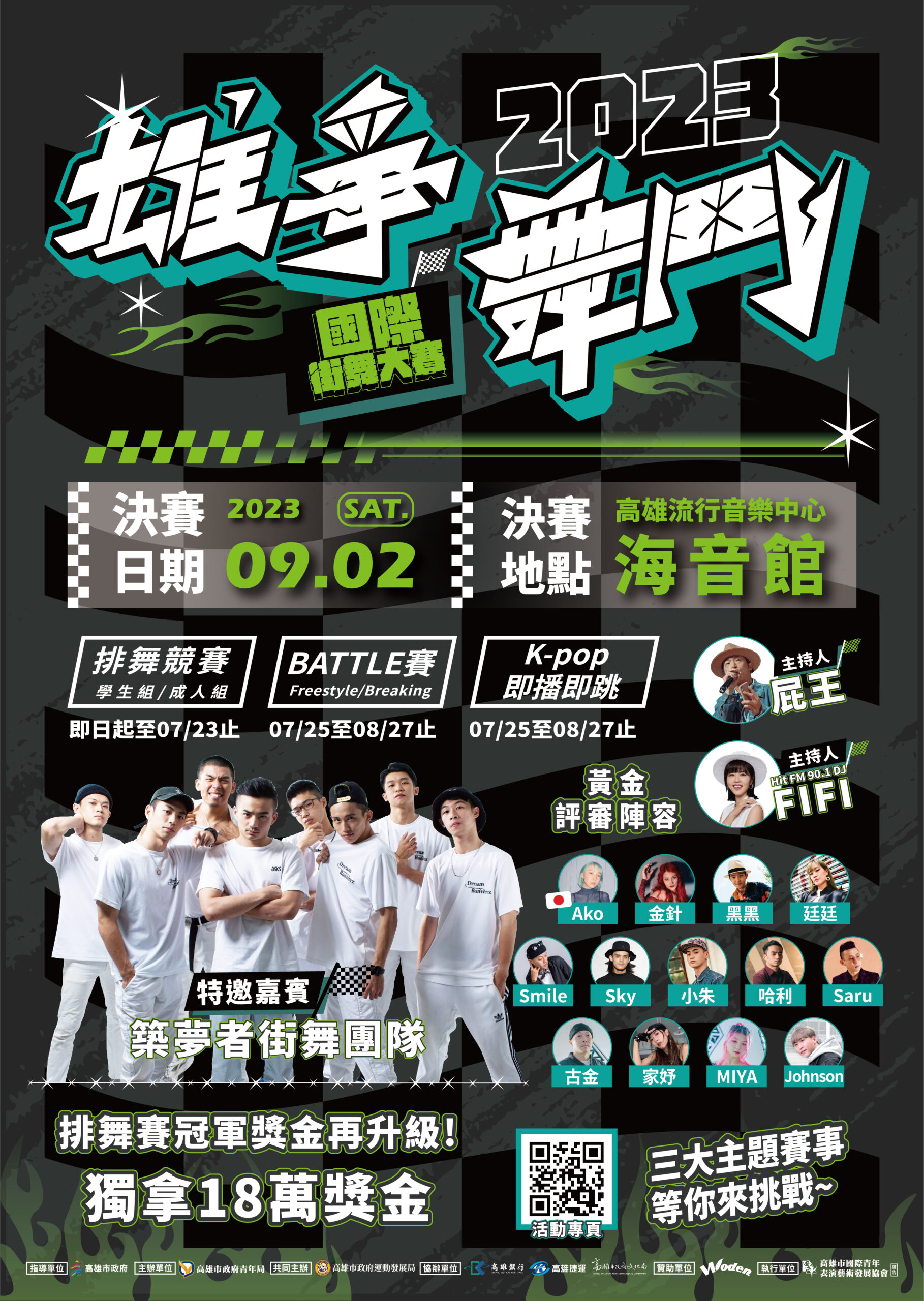 高雄市政府青年局-2023雄爭舞鬥國際街舞大賽活動資訊 / 2023 年 7 月 13 日 一、決賽時間:2023年09月02日14:00-21:00。 二、報名期間:即日起 2023年08月27日。 三、活動地點:高雄流行音樂中心海音館。 詳情請參閱附檔活動簡章與海報。 活動簡章下載