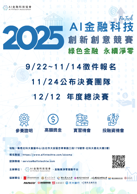 【高額獎金等你拿!】🔥AI金融科技創新創意競賽正式開跑!活動資訊, 競賽資訊 / 2025 年 10 月 22 日 活動詳細資訊請至網站查詢:https://www.aifintechtw.com/aicomp