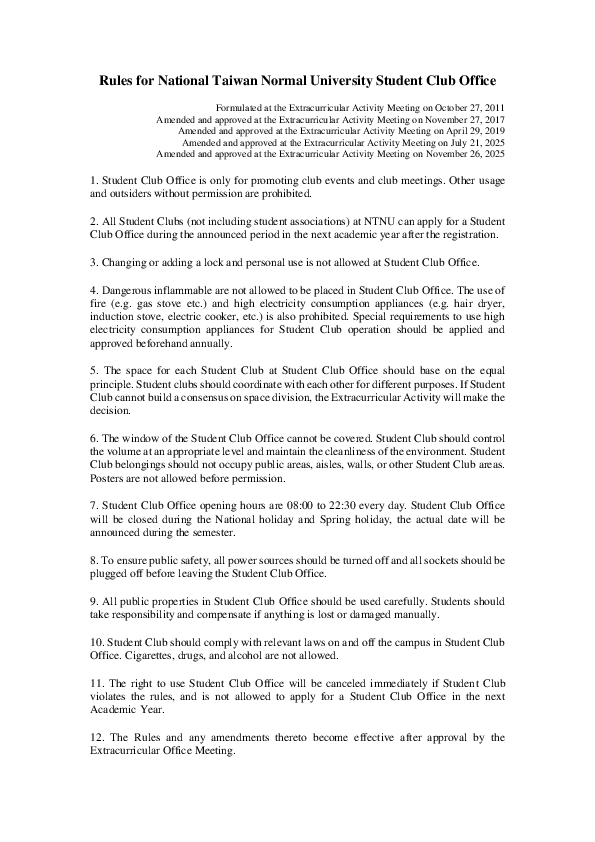 | Rules for National Taiwan Normal University Student Club Office | 34.98 KB | DownloadPreview |
