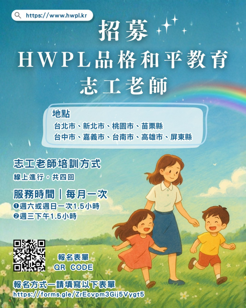 我們是推動全球和平教育的國際NGO組織 HWPL(Heavenly Culture, World Peace, Restoration of Light)。目前在台灣持續與育幼院及國小合作,推動「品格與和平教育」課程,陪伴孩子們學習尊重、理解與和平共處的價值。
