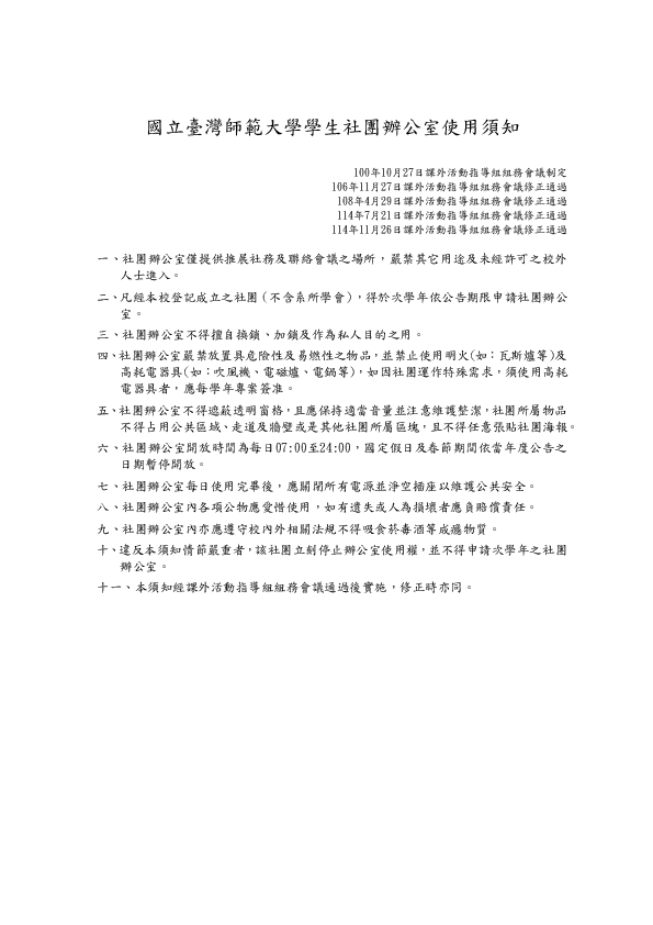 | 國立臺灣師範大學學生社團辦公室使用須知 | 95.03 KB | DownloadPreview |